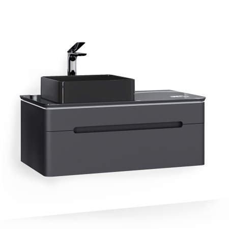 Тумба подвесная. Фасад и корпус изделия выполнены из МДФ в матовой пленке ПВХ цвета антрацит. Столешница с подсветкой выполнена из стекла Lacobel. Так же в данной комплектации предусмотрен встроенный в столешницу многофункциональный модуль, которыйпоказывает температуру в помещении, время, дату, есть возможность прослушивания музыки, подключившись через блютус, в тумбе встроены 2 динамика.