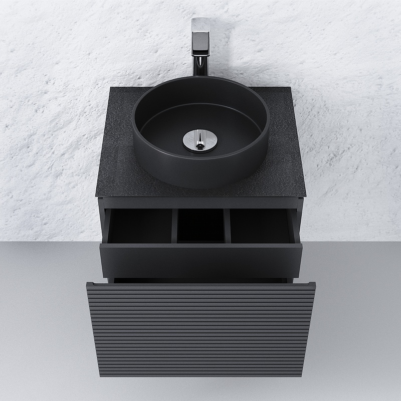Корпус и фасад тумбы выполнен из МДФ в пленке ПВХ, В комплект входит столешница из высокопрочного материала керамогранит. Ящики тумб оснащены доводчиками.
