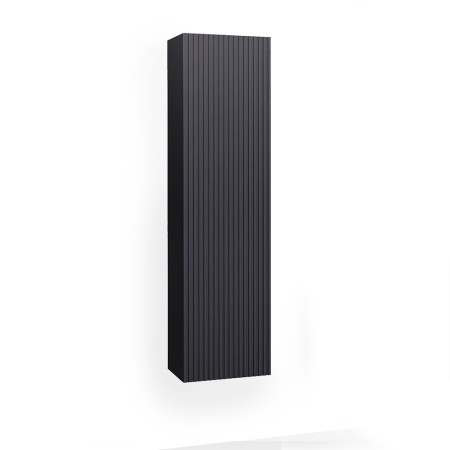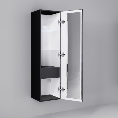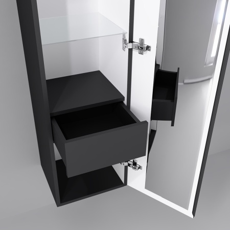 Подвесной пенал выполнен из МДФ в матовой пленке ПВХ цвета антрацит. Оснащен одной дверкой вертикального открывания и удобной интегрированной ручкой, внутри стеклянные и деревянные полки и встроенный шкафчик.